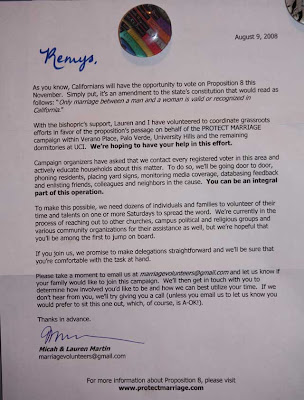 I was delighted to see your continued defense of one of your largest patrons, San Diego mega developer and hotel owner Doug Manchester who gave $125,000.00 to your effort to take away our newly recognized fundamental right to marry in California (but more on that below). Somehow you try to justify his contribution, while attacking individuals and companies that are opposed to your hateful Constitutional Amendment, Proposition 8 on the November ballot.
